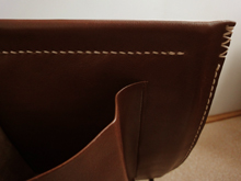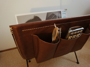 元々、籐製だったマガジンラックをレザーでリニューアル。お客様のご要望で、サイドに眼鏡やテレビのリモコンを入れるポケットを付けました。ハンドステッチをアクセントにしています。