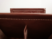 元々、籐製だったマガジンラックをレザーでリニューアル。お客様のご要望で、サイドに眼鏡やテレビのリモコンを入れるポケットを付けました。ハンドステッチをアクセントにしています。